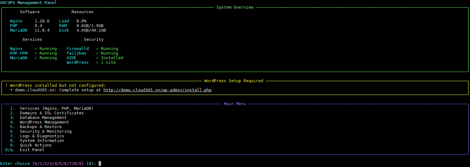 Ngoài ra, webserver sẽ được tự động tối ưu cấu hình để đảm bảo có hiệu suất hoạt động tốt nhất, bảo mật nhất. Ngay cả những bạn mới làm quen với VPS cũng có thể quản lý VPS thông qua menu dòng lệnh đơn giản, gọi bằng lệnh hocvps